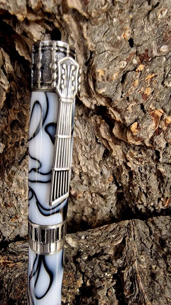 Der Music Twist Drehkugelschreiber ist aus schwarz/weiß gegossenem Acryl gefertigt. Er besticht durch seine Marmoroptik zusammen mit den Musikmotiven.